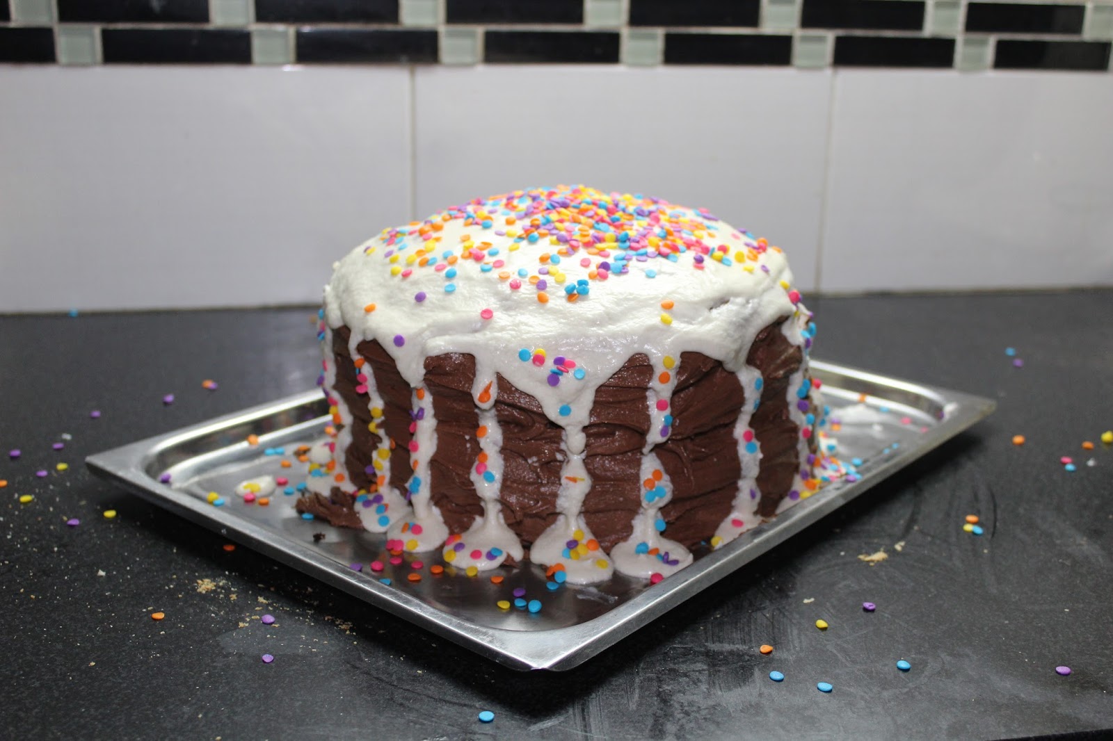 I present to you all, a three layered moist chocolate cake glazed with a rich chocolate icing in between and around each layer, dazzled on top with a sweet vanilla paste and glittered with sprinkles.